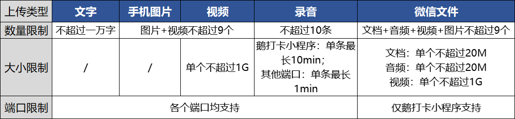 打卡目前支持学员上传文字、录音、手机图片、手机视频及微信文件,具体的数量及大小限制如下: