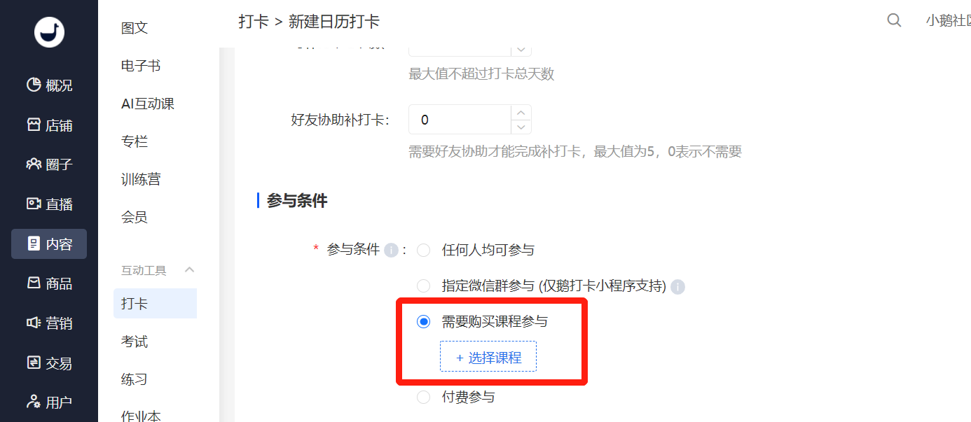 在新建打卡页面中,找到【参与条件】中选择【需购买课程参与】,选择相应的课程即可。