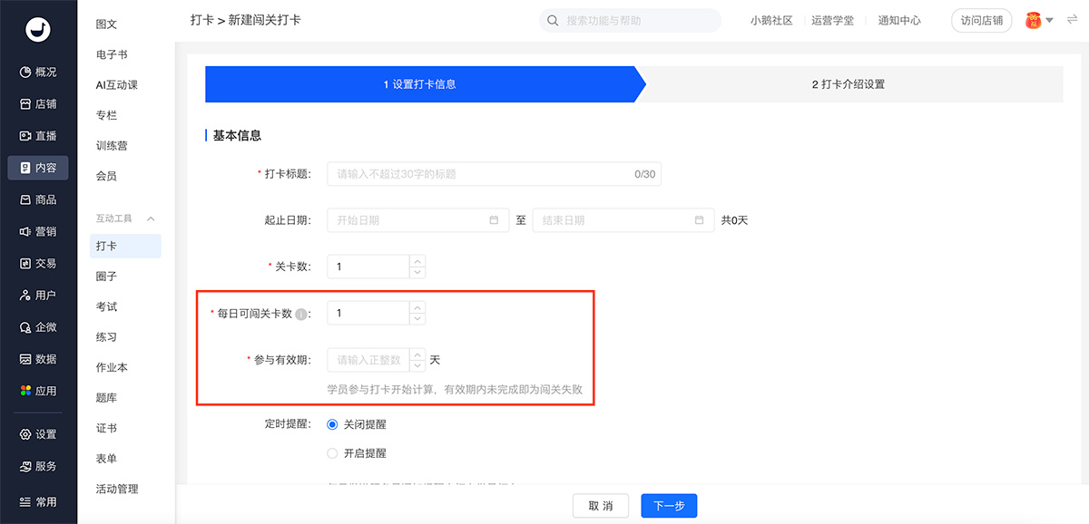 闯关打卡可以通过设置【每日可闯关卡数】和【参与有效期】来刺激学员的活跃度。