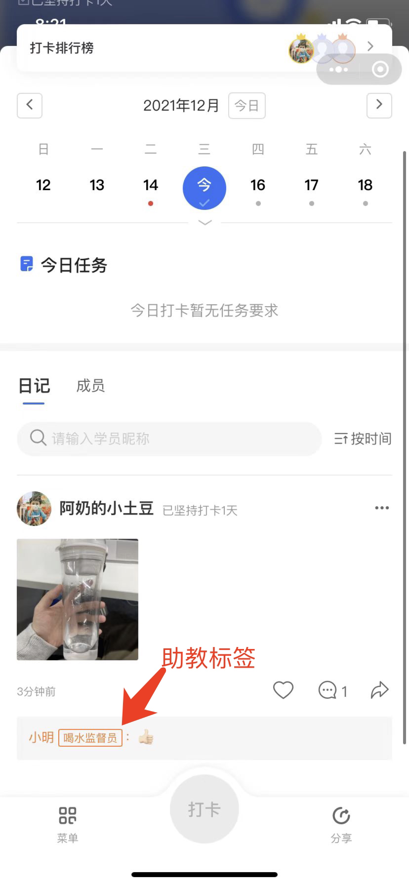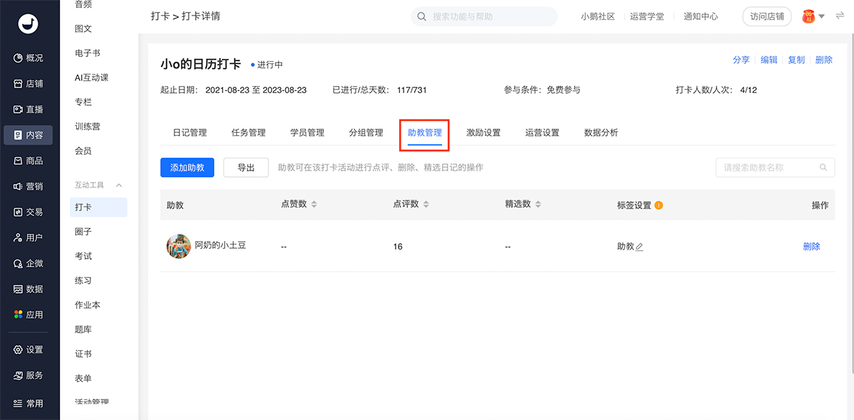 在打卡详情页中的【助教管理】模块中,可以查看该助教的相关数据,亦可新增获删除助教,还可以对助教在学员端显示的标签进行设置。