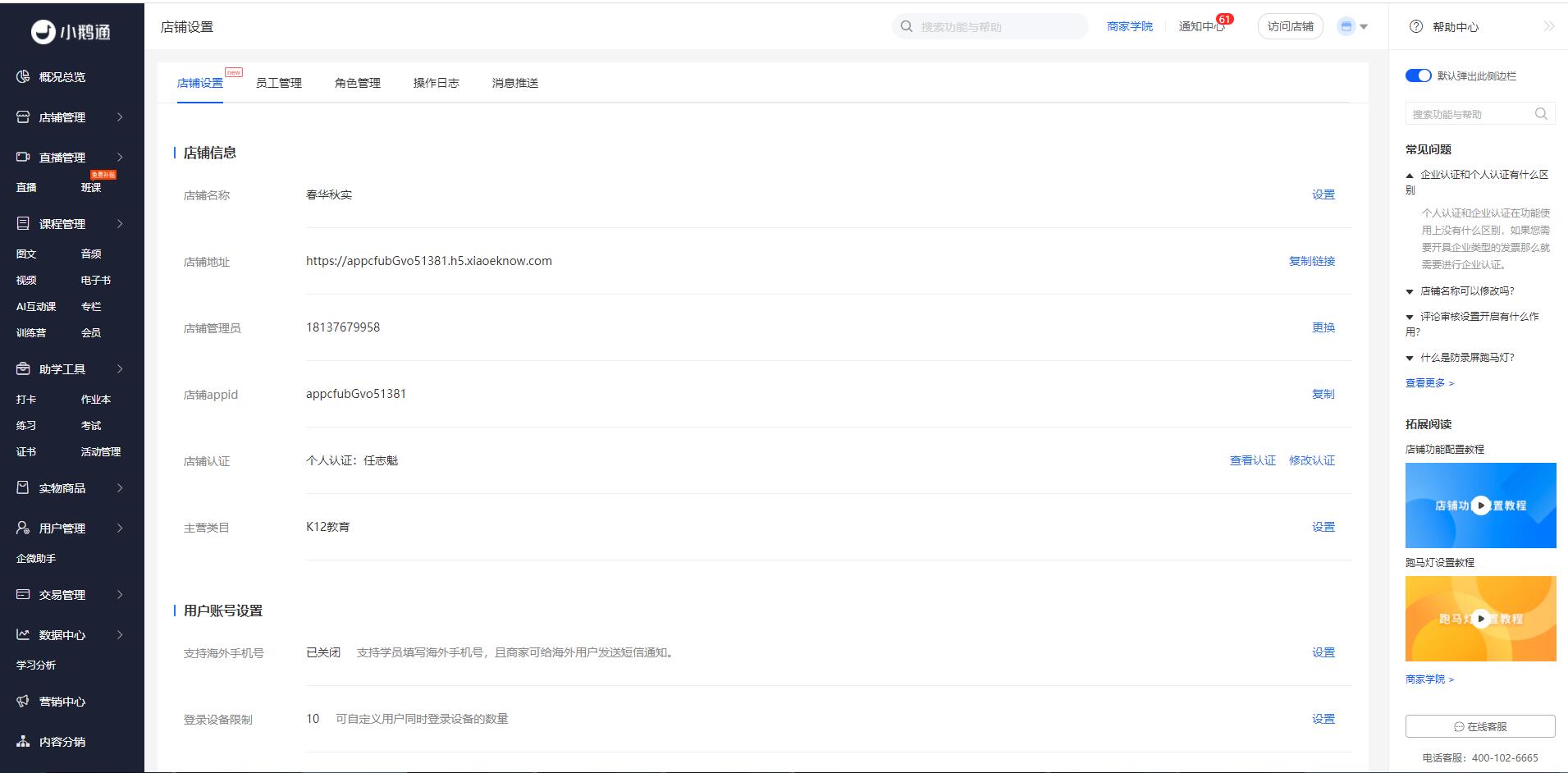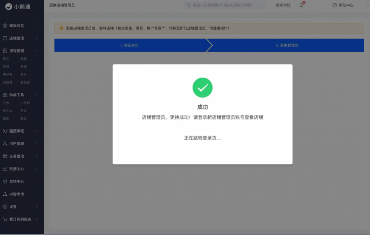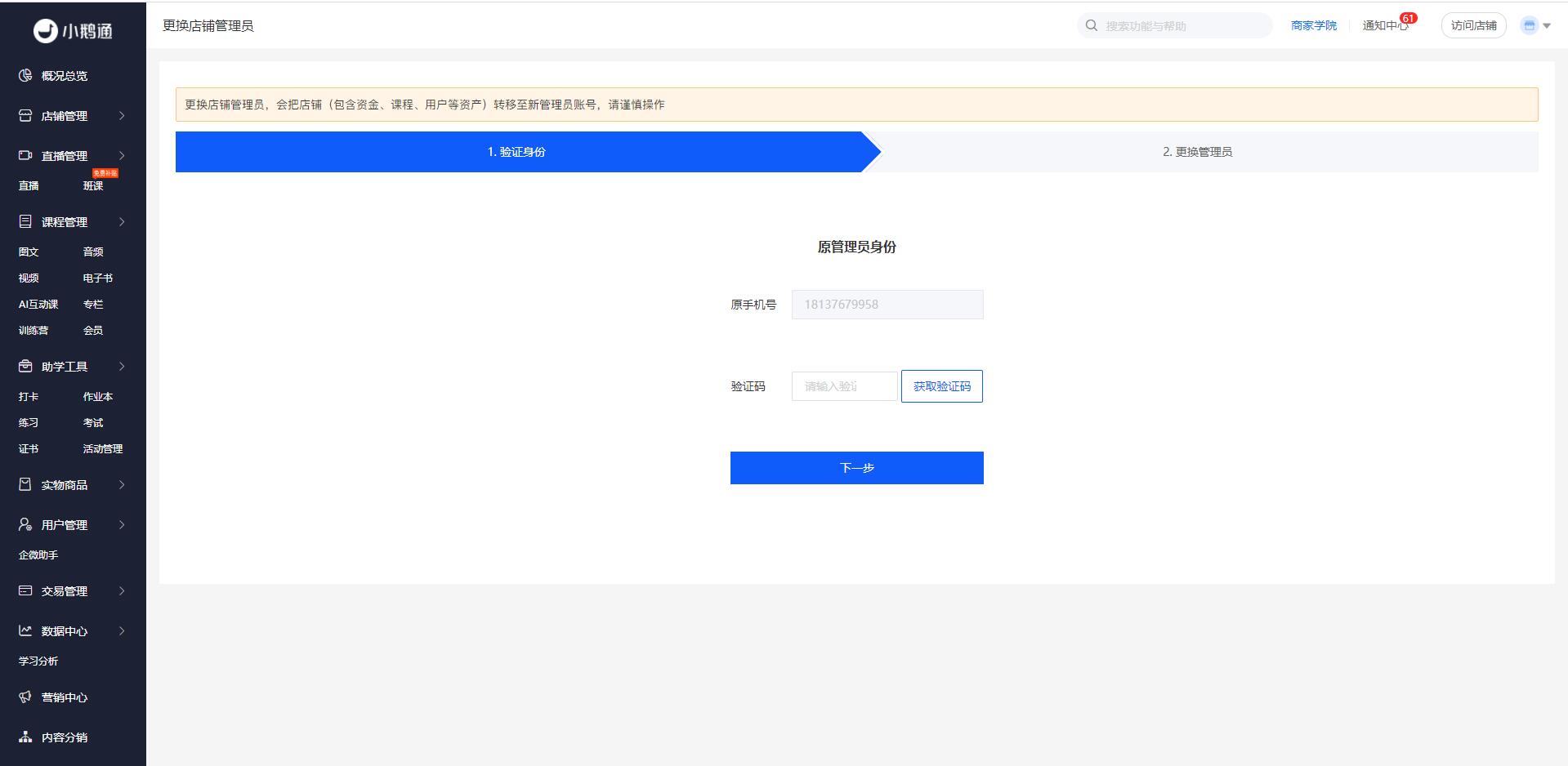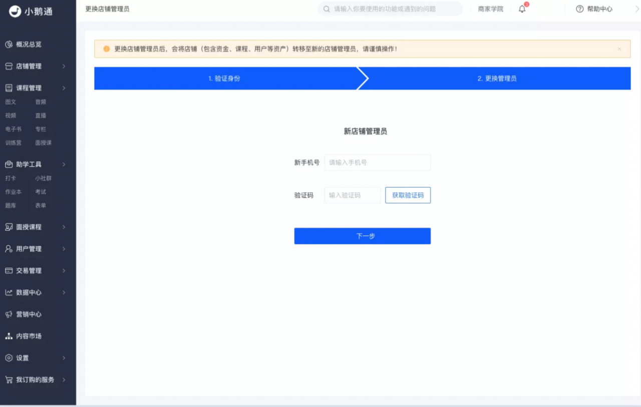 特别注意:新店铺管理员的手机号,必须已经在小鹅通注册,若未注册请提前注册