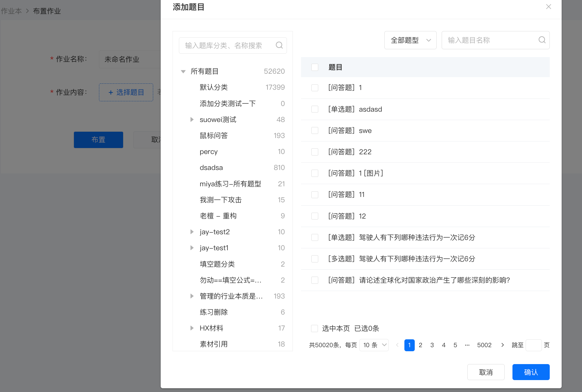 2、在左侧题目分类中选择相应分类,右侧将展示所有的题目,全选/多选题目,点击【确认选择】,则批量导入成功