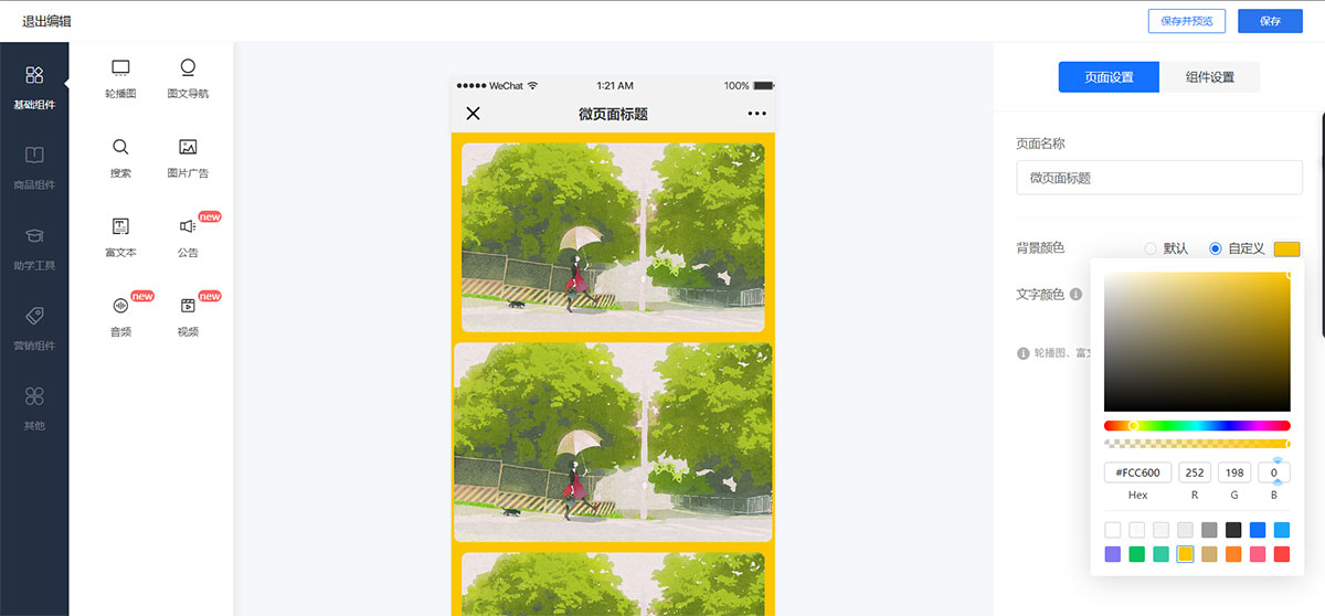 **注:微页面可以修改背景颜色,但是无法设置背景图。