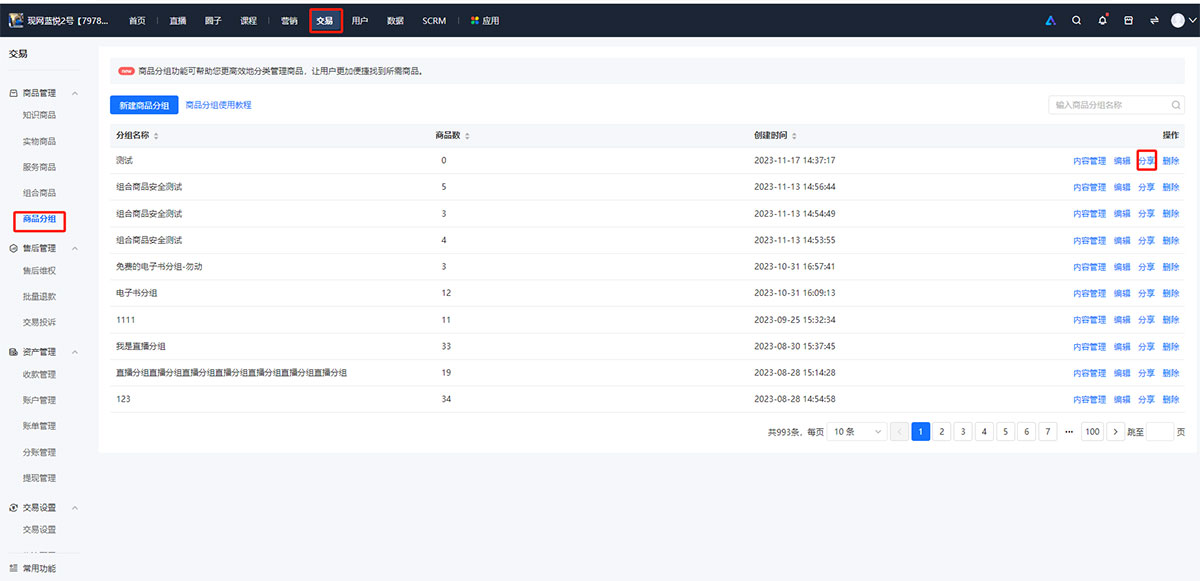 (2)可将整个商品分组页面的内容进行对外分享,点击:【交易】-【商品管理】-【商品分组】-【分享】分享分组页面即可。