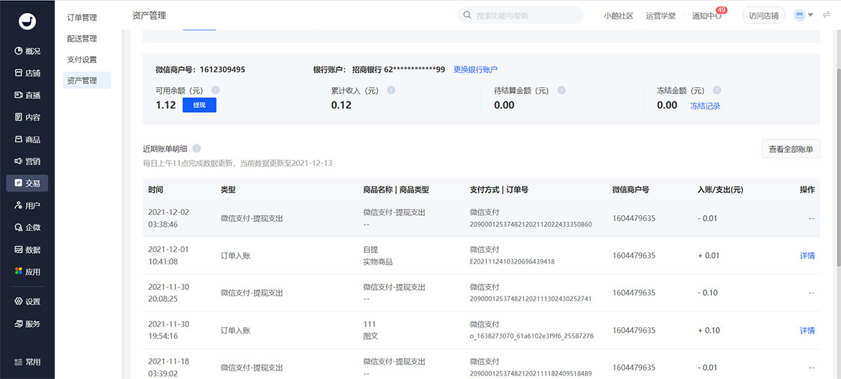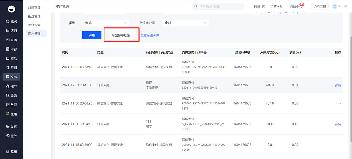 通过【交易】-【资产管理】-【我的账户】-【服务商模式账户】-【查看全部账单】进入账单列表页,查看并导出您需要的账单记录。