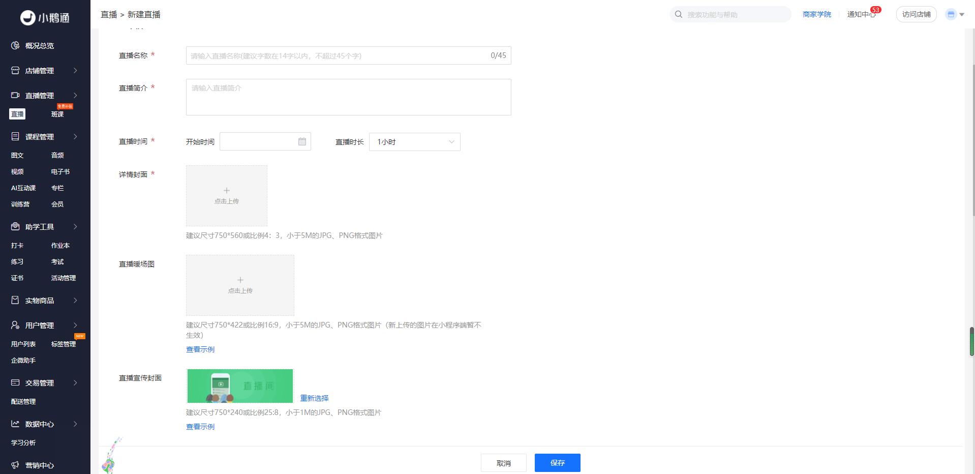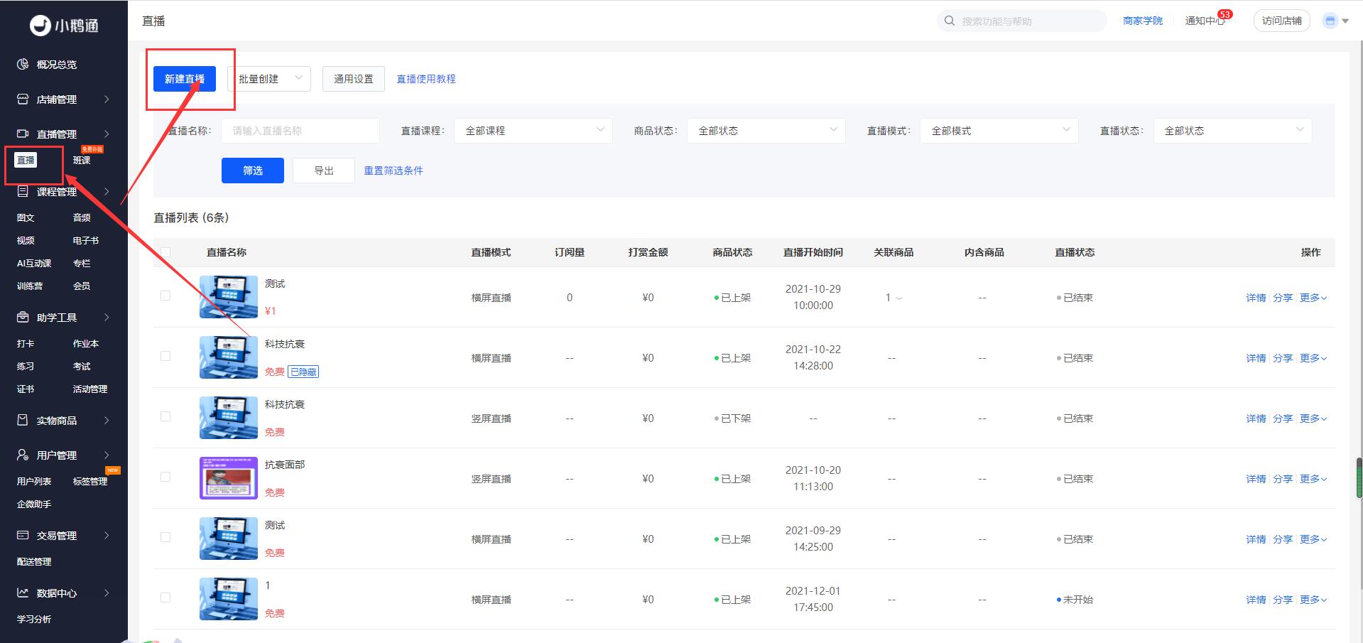 1、登录小鹅通店铺管理台,依次选择【直播管理】-【直播】-【新建直播】