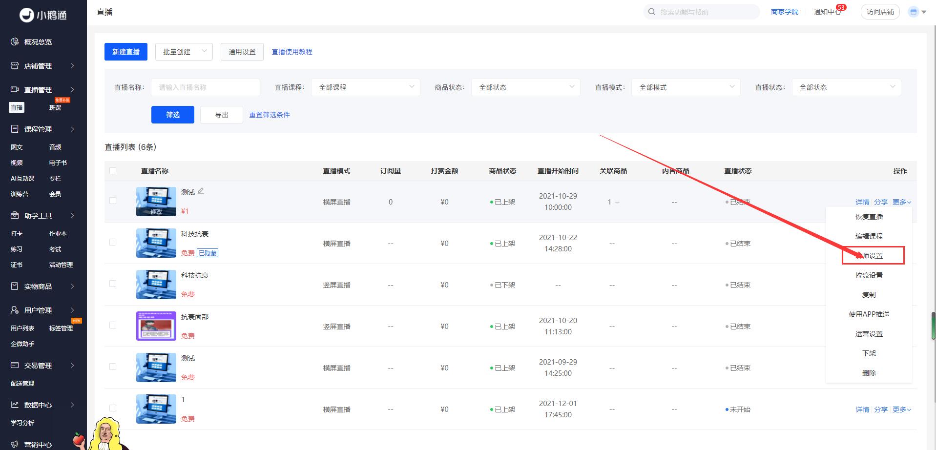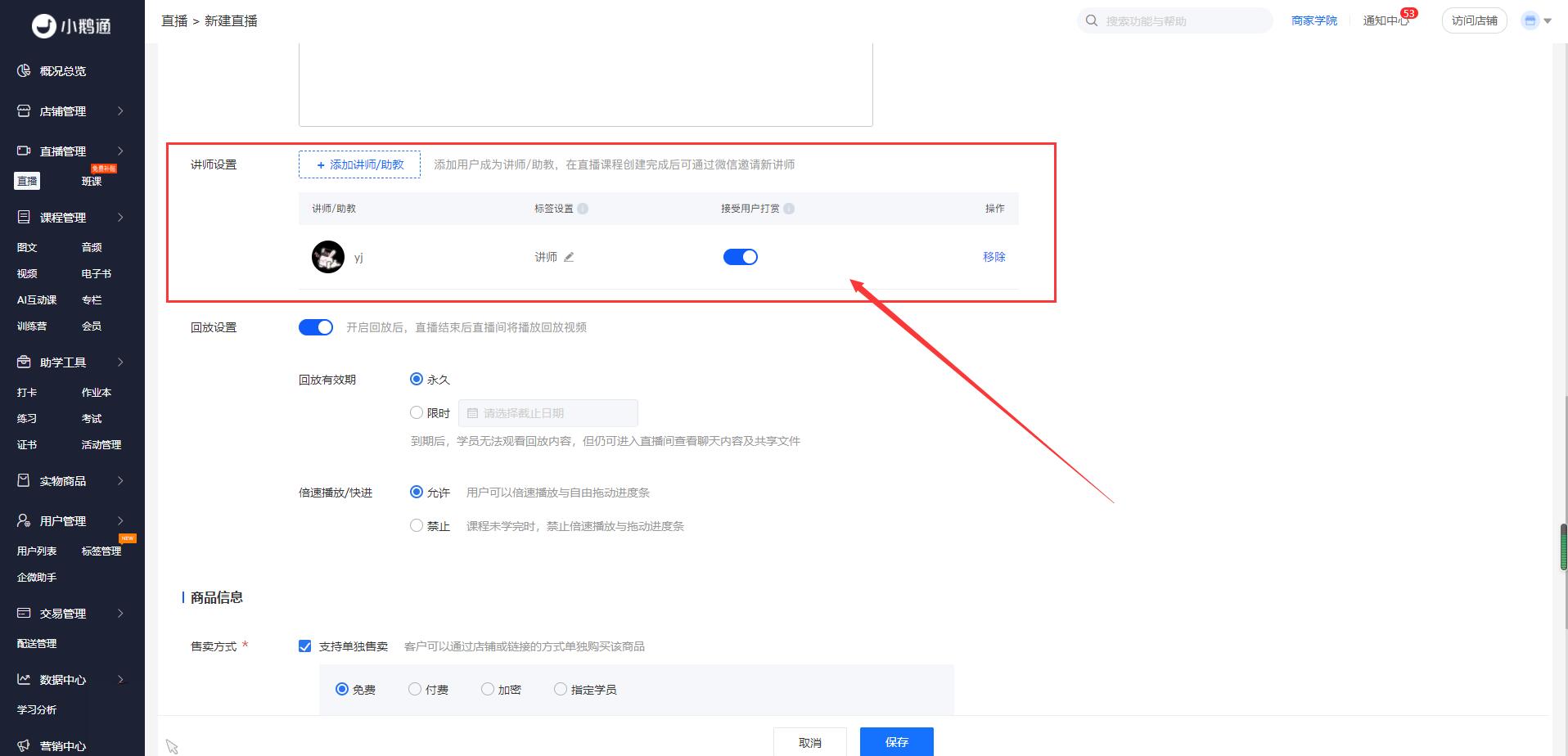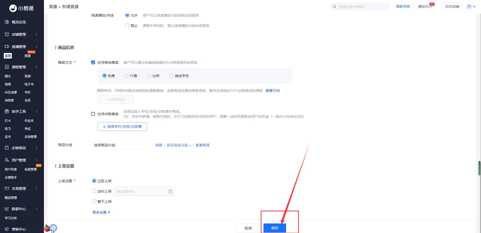 商家端:店铺管理台 → 新建直播 → 更多设置 → 去直播/分享课程