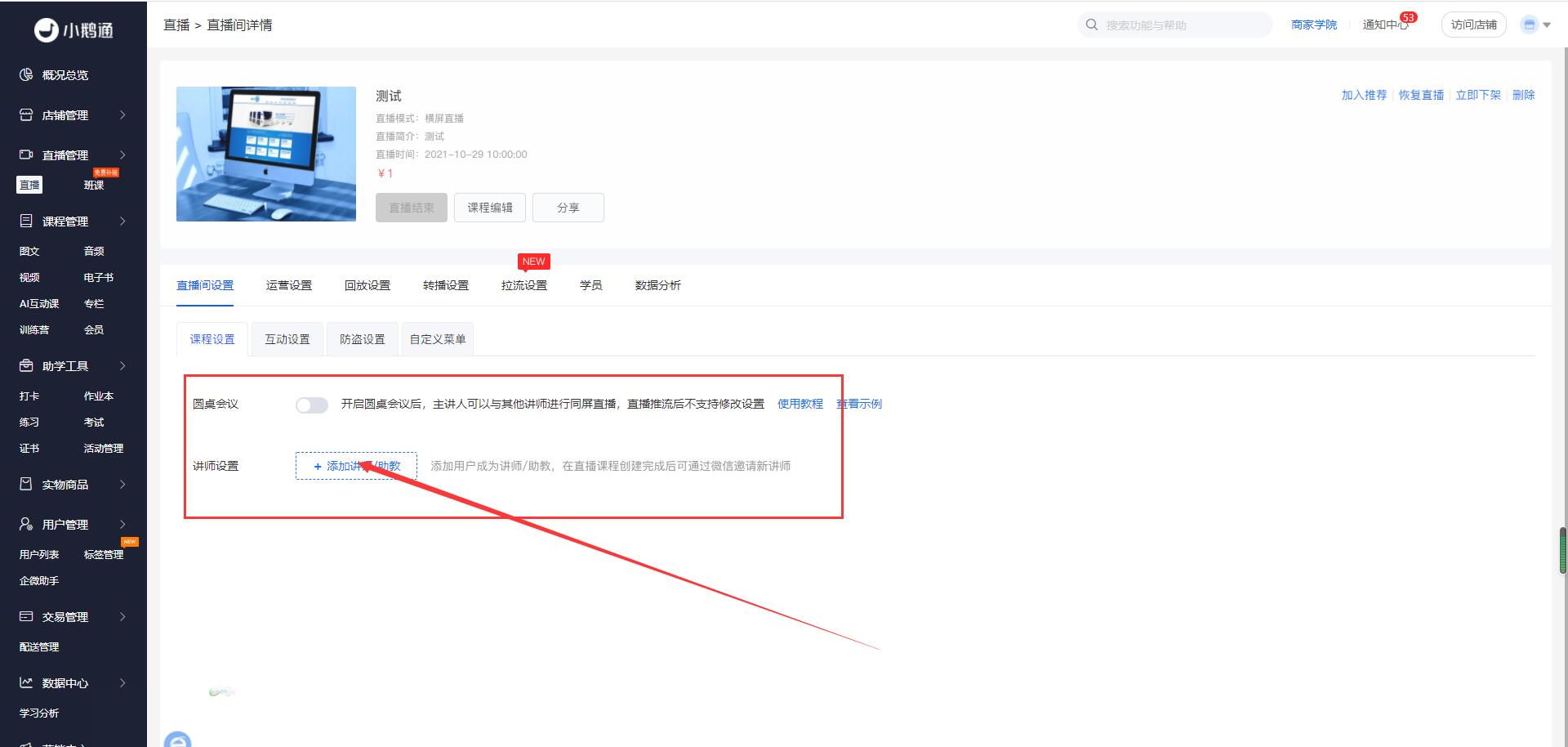 ③或进入直播详情页中的【直播间设置】-【课程设置】-【添加讲师/助教】添加讲师。