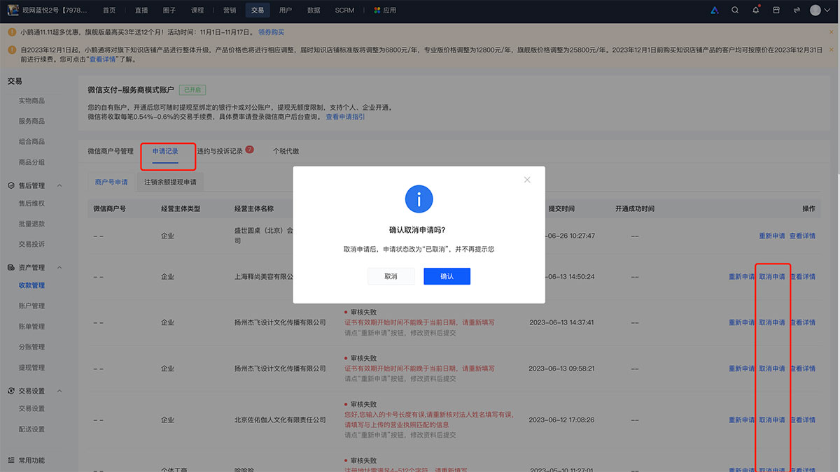 当您在申请过程中,出现特殊情况(如填写错误、无法找到法人签约等),均可以在申请状态是【审核中】【账户验证】【待签约】时,点击“取消本次申请”按钮。若您要重新发起申请,此时的申请页面仍会保留最近一次填写的内容。示例图: