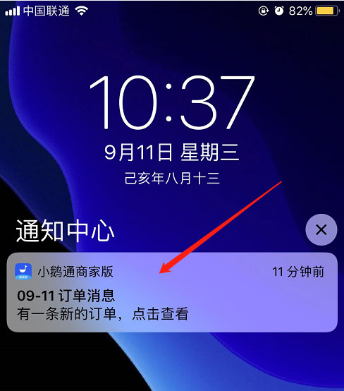 当店铺有新订单时,您可以收到APP提醒,点击可打开APP查看: