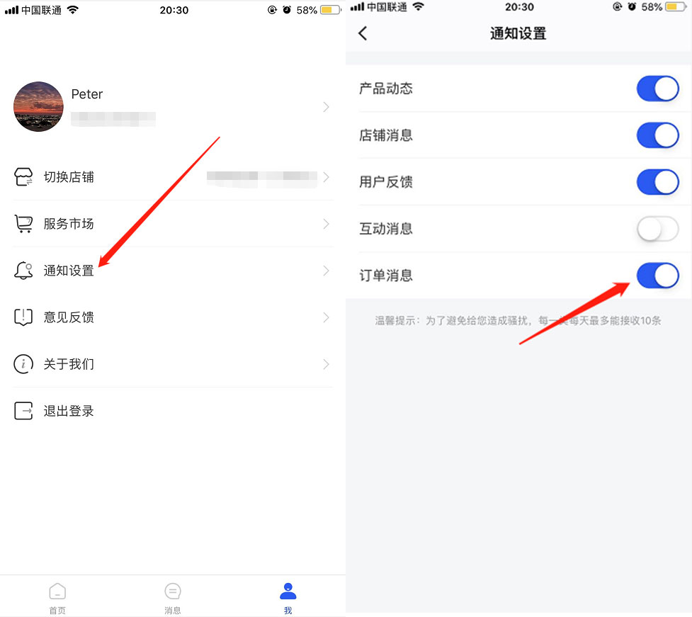登录后选择您的店铺,进入【我】--【通知设置】,打开“订单消息”。
