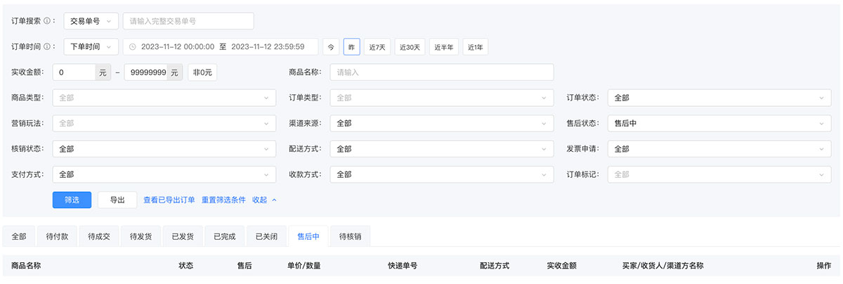 进入【管理台】-【交易】-【订单管理】-【下单时间】,将【下单时间】设置为昨天的日期,即可看到订单信息,您也可以设置更多订单查询的条件(订单状态、渠道来源、订单状态、订单类型等)