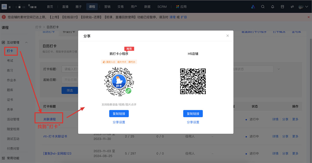 1、在管理台选择所要分享的打卡,点击【分享】,即可看到鹅打卡的小程序码及链接。