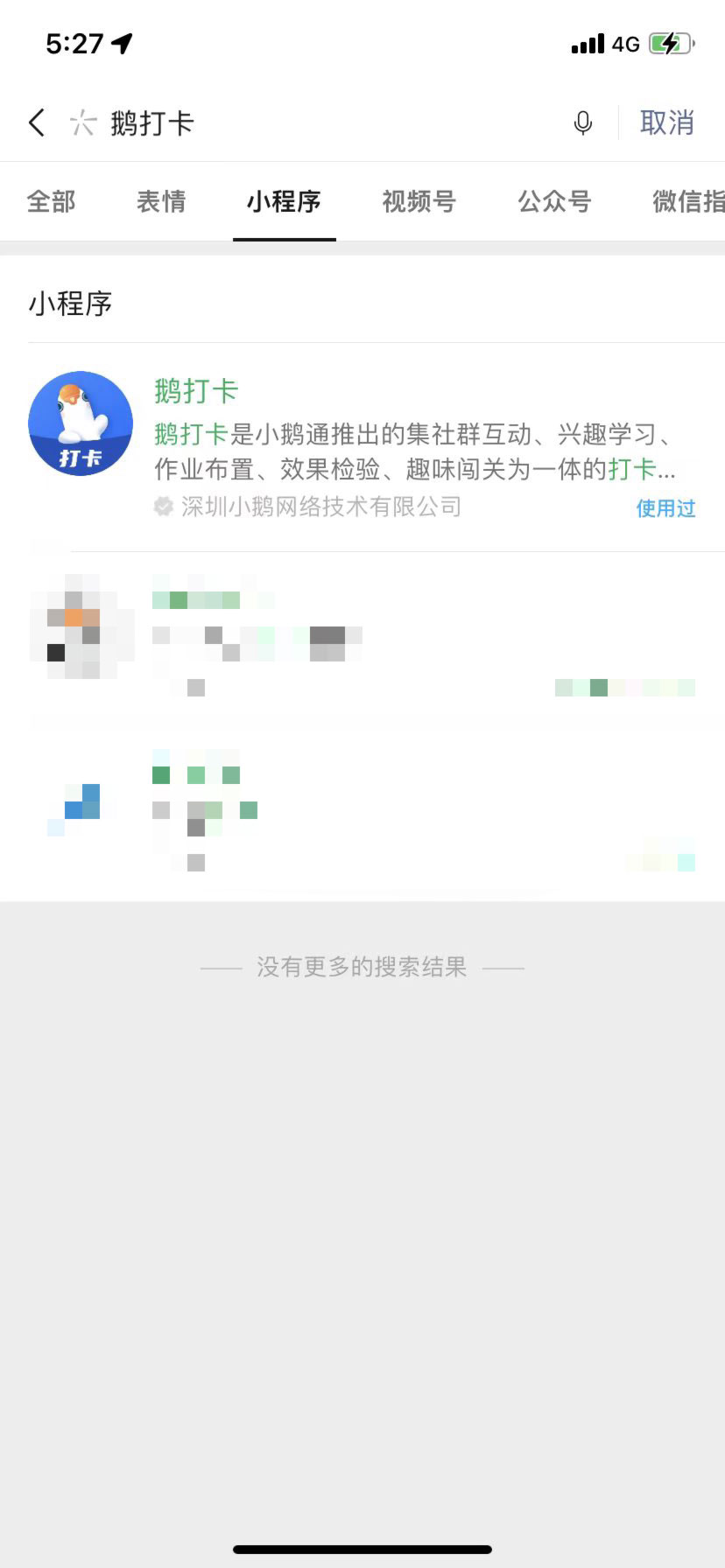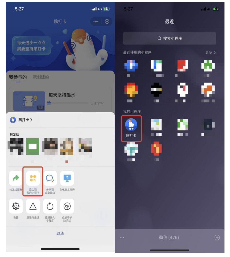 3、点击鹅打卡小程序右上方【...】,选择【添加至我的小程序】,之后直接在微信首页下拉,即可快速找到鹅打卡。