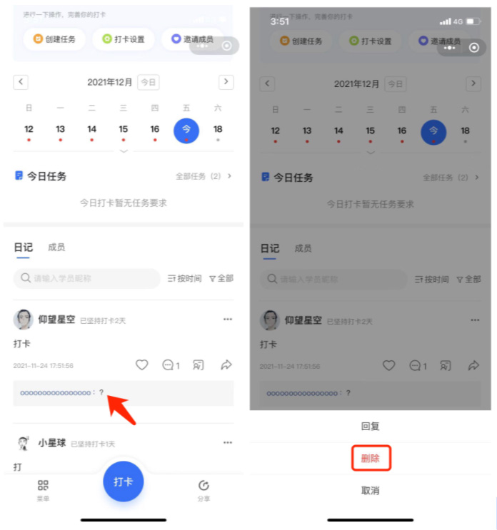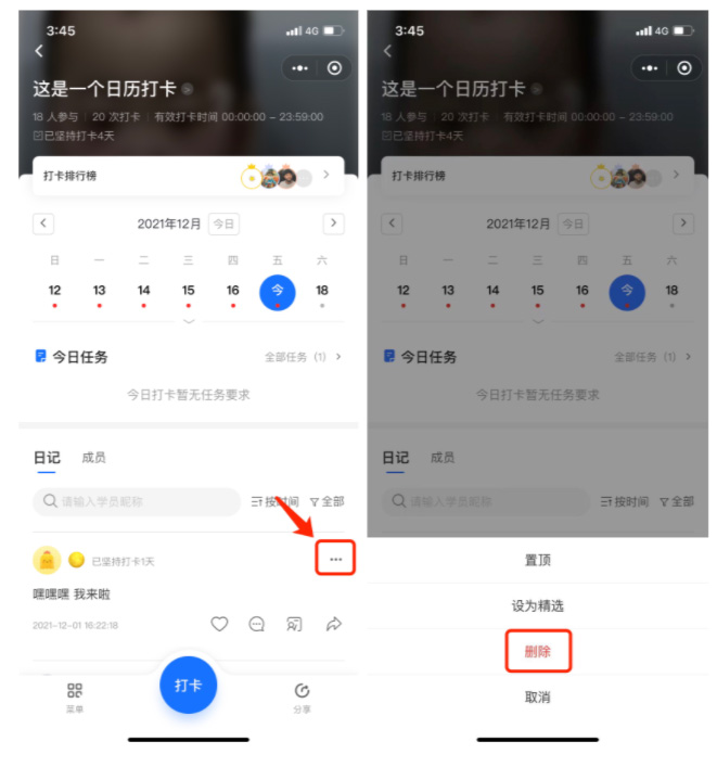 在运营打卡的过程中,经常会出现一些内容和打卡无关的日记和评论,这时可选择删除这些内容,避免影响打卡的氛围。