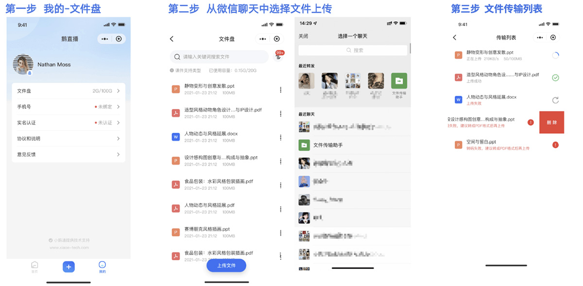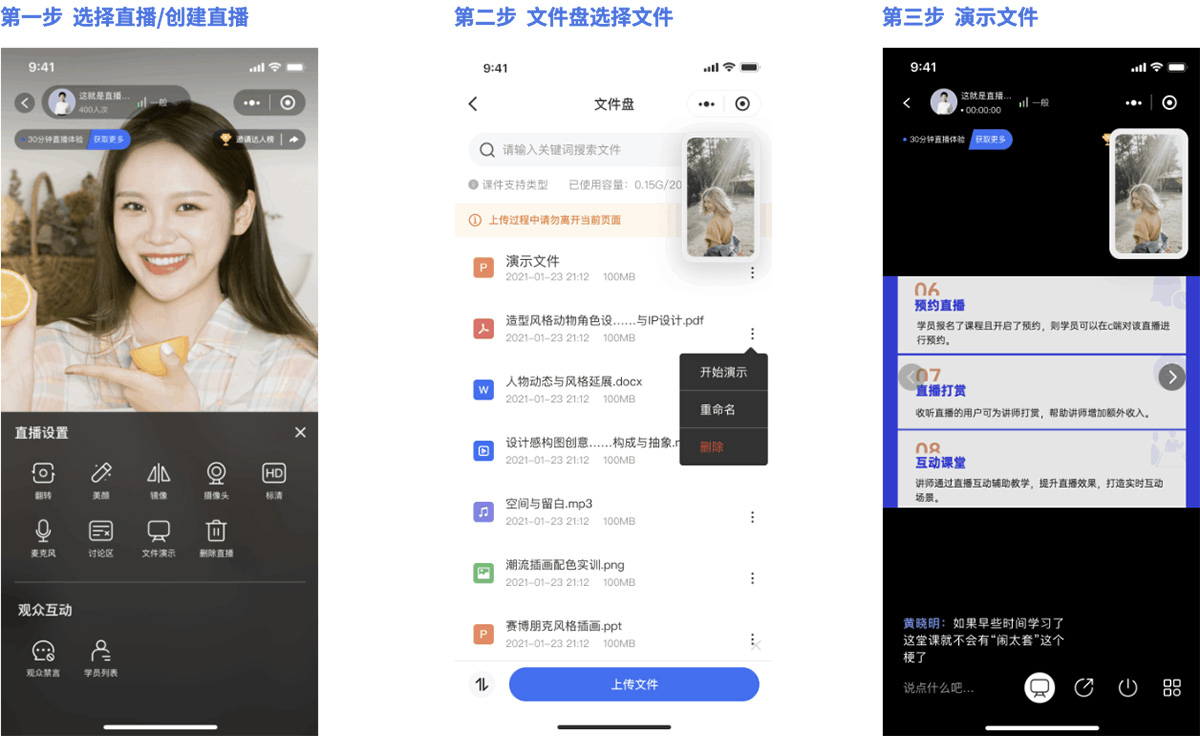 用户在小程序直播时可以同时演示课件内容;在操作时首先需要用户将文件上传至【文件盘】,然后在直播时选择文件进行演示。