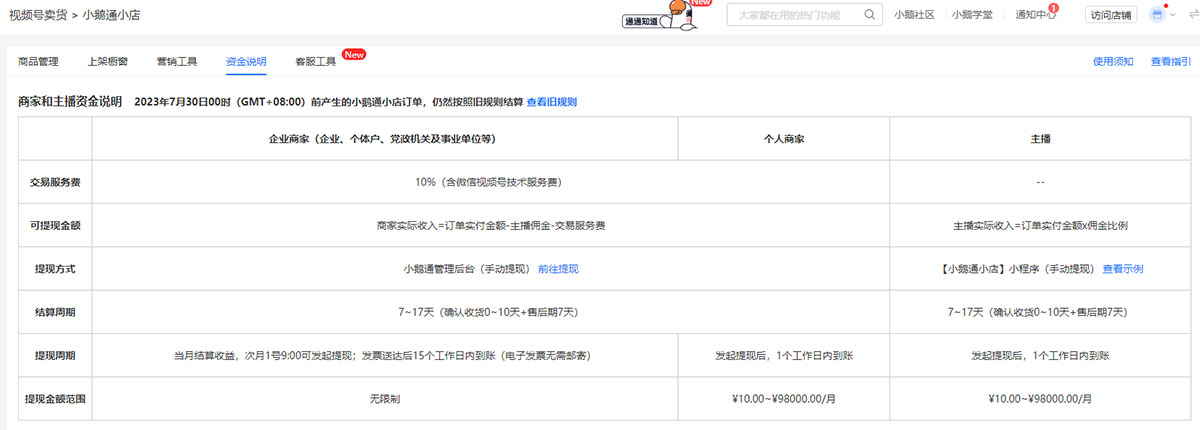 自2023年7月30日00时(GMT+08:00)起,小鹅通小店结算规则调整为:每笔订单统一扣除实付金额的10%(含微信视频号的技术服务费),剩余金额与商家进行结算。