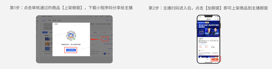 方式1:商家将管理台审核通过的商品分享给主播,主播扫码进入后点击【加橱窗】即可;