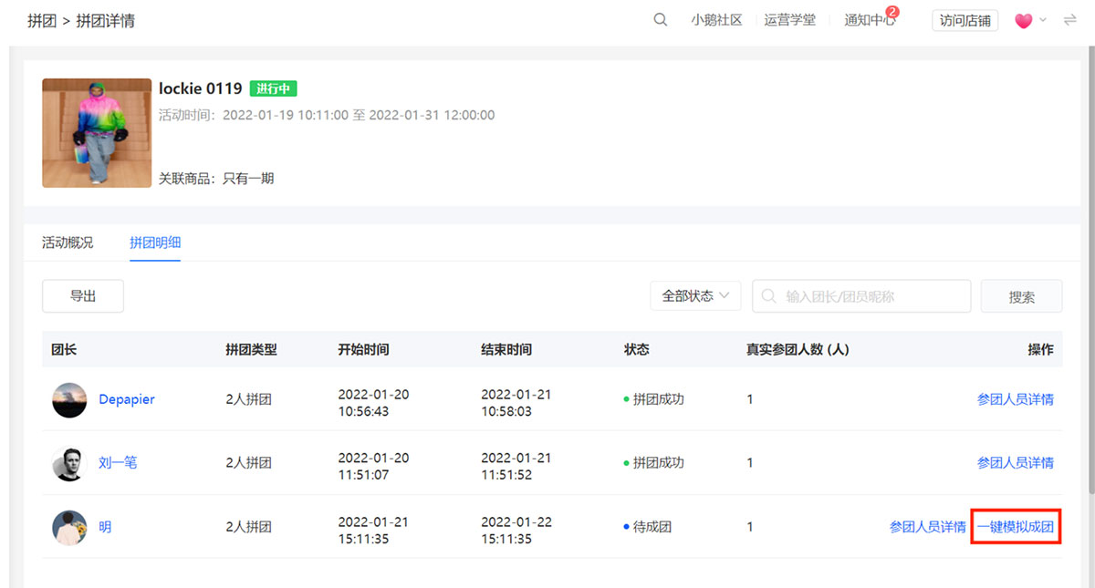 ② 商家在创建拼团时,并未开启“模拟成团”,但出于某些原因,想帮助某些团成团,此时就可以进行“一键模拟成团”操作。