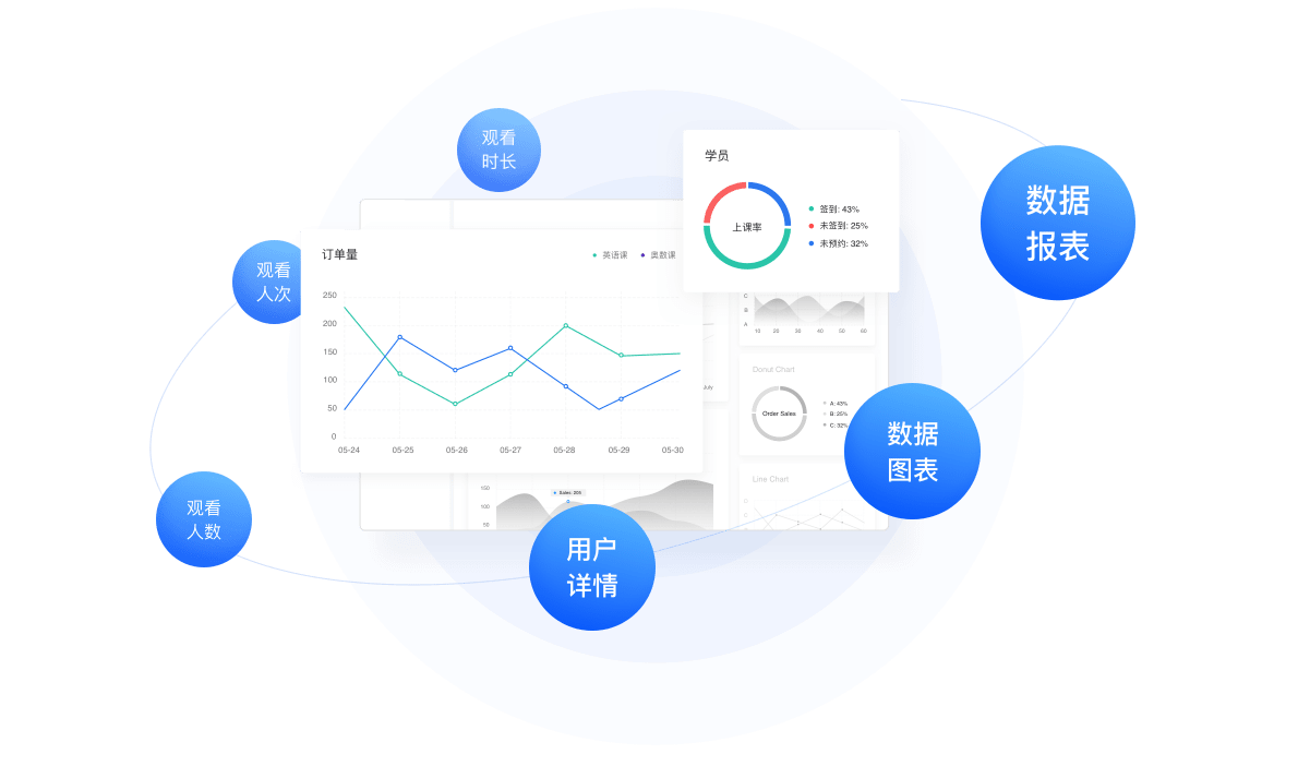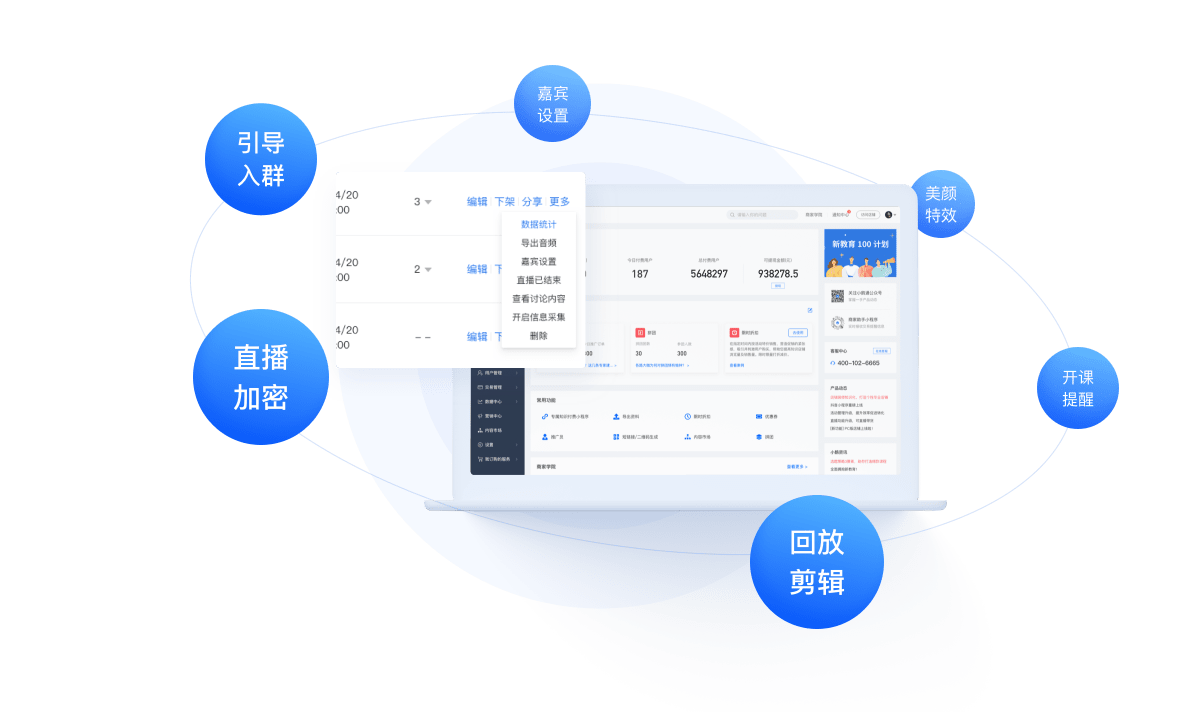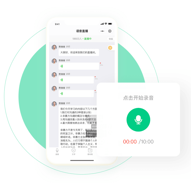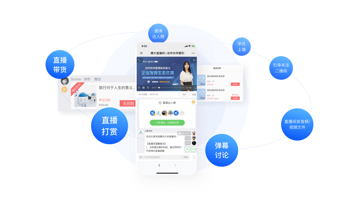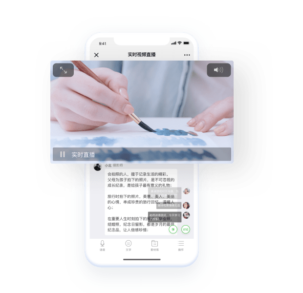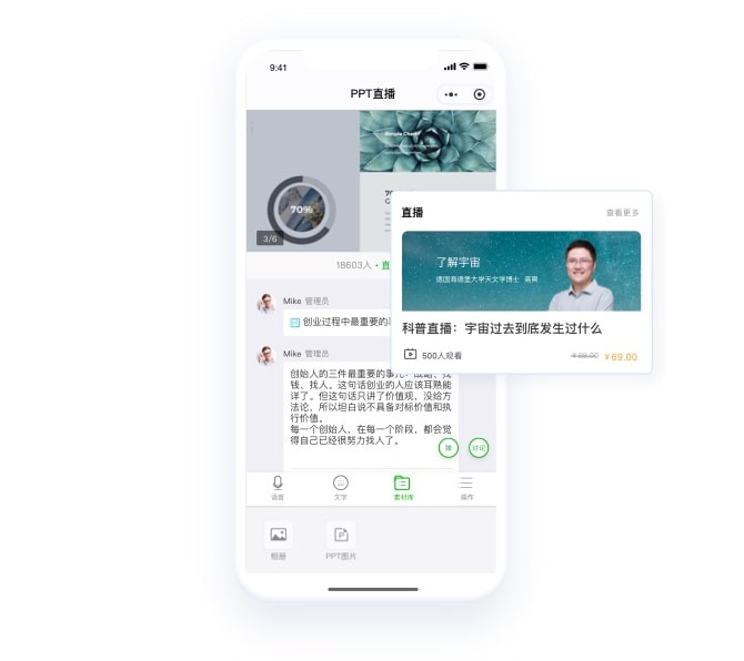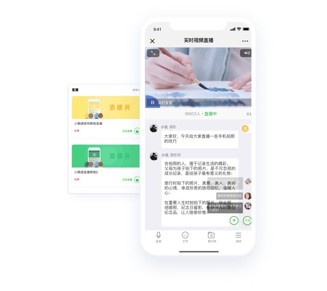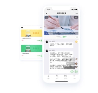 适合班课、互动型场景,真人在线讲解,可使用小程序、App、PC端网页、外接摄像机发起直播。